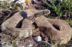 This is the most dangerous snake in North Cyprus and you must be very careful should you come across one as its bite can be deadly. It is also a protected species and it is illegal to kill them (not that you should consider killing any snake of course!). It is extremely well camouflaged being a grey-brown colour which blends in with the rocky terrain that it favours, so keep alert whilst out walking in mountain areas. However, they are known to like areas around swimming pools during the hotter summer months (perhaps because of the wildlife that will come to drink at pool-sides). In shape it can be quite fat in appearance and growing to around 1.5m and is determined by its diamond patterned back. It will warn you of its presence with hissing, but will attack quickly if threatened. Its bite is made more dangerous by the fact that it imbeds its fangs into tissue and pumps large amounts of poison into the wound. We have come across these snakes frequently whilst out walking in the mountains, and more often than not they will slither away faster than you could run away!